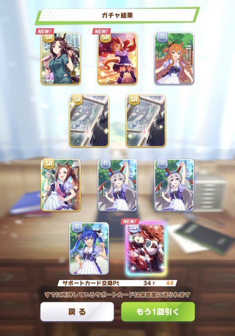 無料10連で一向にメジロラモーヌが引けないので、試しに手持ちを放出したところご覧の結果に。思いの力…! #ウマ娘