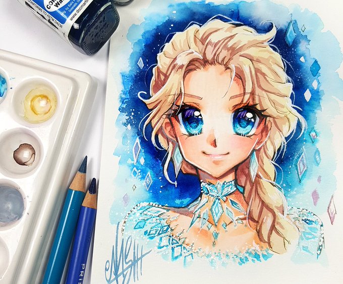 #Elsa with #watercolors and colored Pencils.