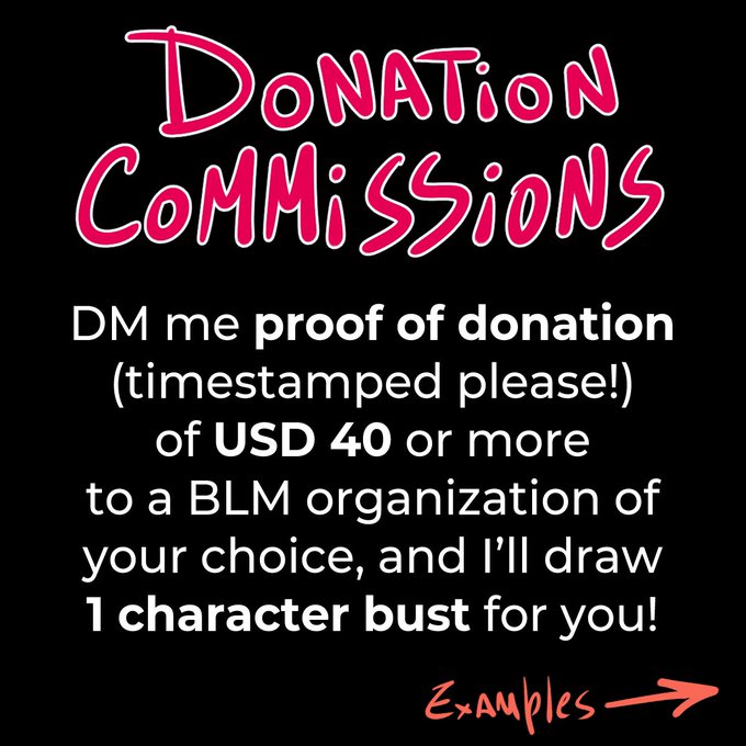 DM me proof (timestamped) of a $40 or more donation to a BLM organization of your choice, and I’ll draw 1 character bust for you (see examples)