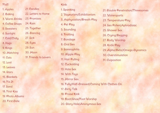 Same rules as last time~! I'll take the first four comments! Pick a number (Be sure to specify Kink or Fluff!) and a pairing, and I'll work my magic! 🪄✨