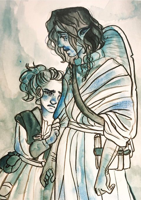 My DM told me that the Maengu, Eryk‘s deities, are tiny selkie-esque creatures floating in the water - which, to me, sounds very adorable so I had to draw one comforting a young Eryk