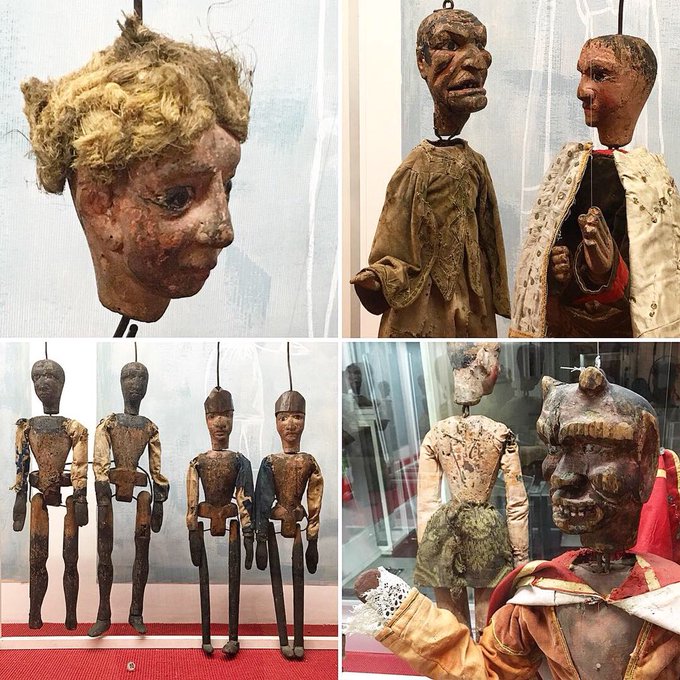 ...There were several brilliant galleries dedicated to the art of puppetry & marionettes. 1st pic is of curious 19th/early 20th century marionettes, 2nd is of 18th century examples, & 3rd pic is a theme I sensed in the painted backdrops for marionette shows 🧔🏻⚔️🧔🏻 #ITweetMuseums
