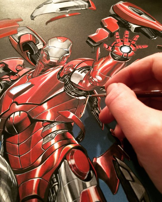 Rendering the hot rod reds in acrylic gouache. #TonyStark #Ironman #MarkBrooks #Marvel #Comics