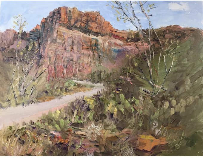 #springbudsZion #springtime #morningview #desertsolitaire #utah #zionnationalpark #oil #pleinair #airstreambambi #zion #markhafemanfinearts #origional #artwork #forsale