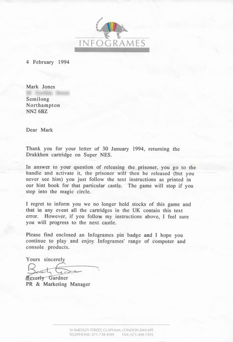 Christmas'93 I bought #Drakkhen on the #SNES. I found a bug which stopped me from progressing. I rang #Infogrames up&they said I should send the cart back. Soon I got this letter explaining how to get past the bug, a metal badge&a hint book. The book is scarce, not seen 1 on ebay