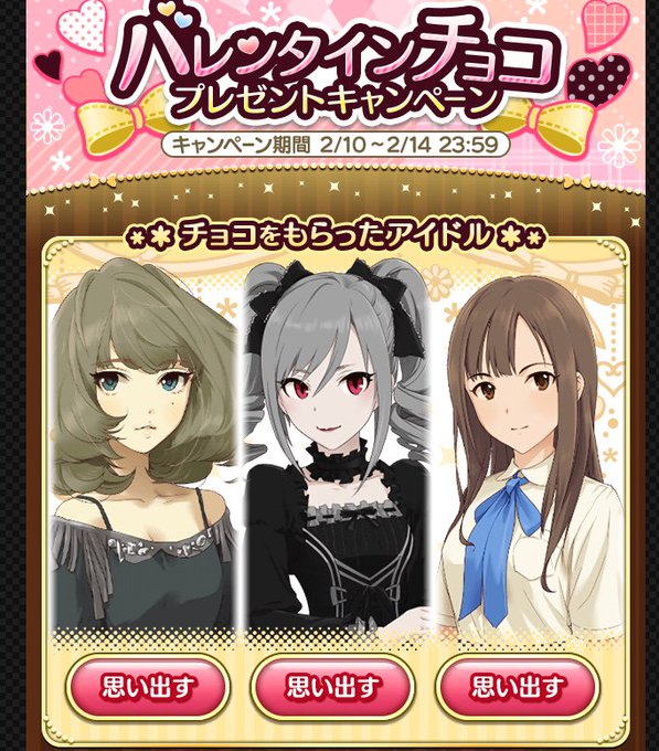 モバマス、今年のバレンタインキャラ 去年との違いは、1日目がゆかりちゃんで、2日目が楓さんになったこと。蘭子ちゃんは自分で会いに行った。