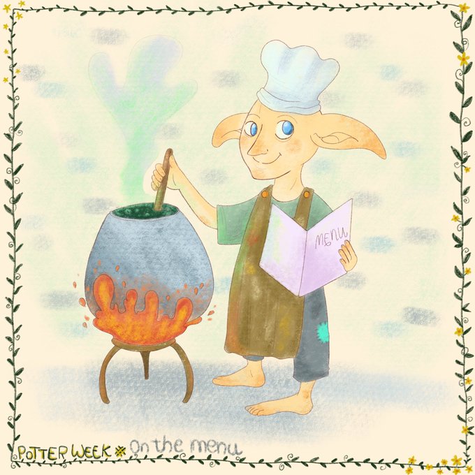 Retomo los #PotterWeekPrompts , para el nº 4 “On the menu “, un elfo doméstico de las cocinas de Hogwarts preparando el menú del banquete de bienvenida.// A elf from the kitchens of Hogwarts preparing the menu of the welcome banquet // @dibujando @ApoyaAlArtista @Ayuda_artista