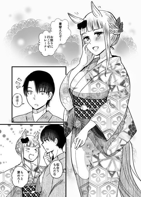 恋愛感情0だけど距離感がバグってるゴルシと男トレーナー トレーナーに髪を結ってもらってお祭りいくやつ。髪型チェンジいいよね【再掲】
