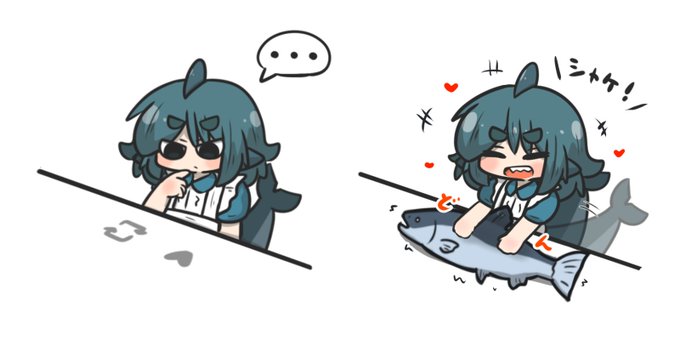 シャケをまるかじりするフカちゃんとヨゴレちゃんです。