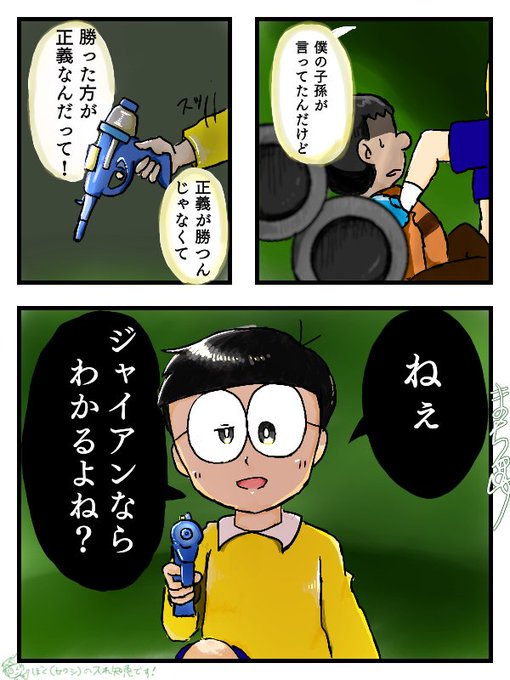今日のドラえもんはノビスケとノビスケの息子が出てくるって聞いたから前に描いたやつを再掲。 ノビスケの息子とノビスケ&セワシ君