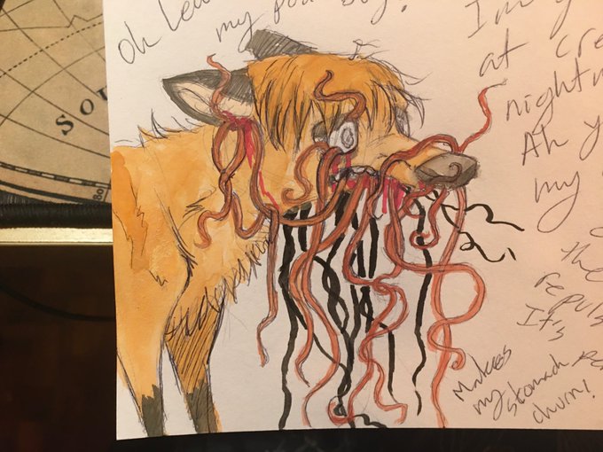 @morganmaccccc Here’s Lewis! He’s a terrible fox who ends up experimented on and later is treated as a prop hit by a cult. His parasites signify enlightening and the return on the Rat King. Lewis isn’t all there anymore, though he never really was…!