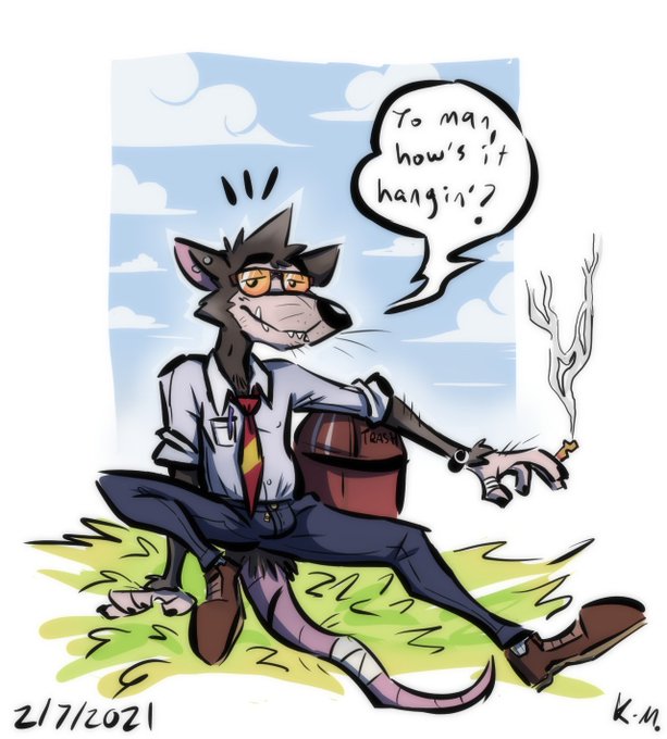 Here's Roger, he paints pretty pictures and wears a bucket for a hat. Ask what happened to his arm and he'll go "Ooh that? Pretty bad yea...no use worrying about it these days!" while going back to his biz. Lives on fries coated in ketchup too. Watch out, he'll talk for days!