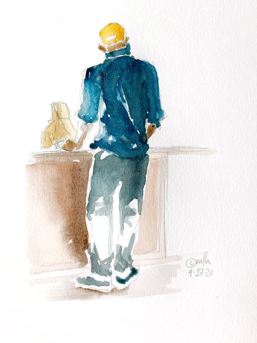 Ordering food to-go on Sunday. Wearing a mask. #pencil #watercolor #Sunday