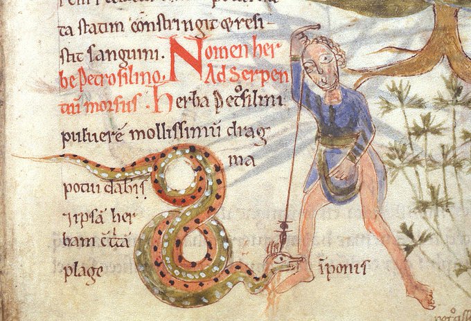 For #WorldSnakeDay, this cheerful adder doesn't look too alarmed by that spear. He appears under the entry for parsley which you'll be happy to learn is helpful against snake bites in this 12th century English herbal (British Library Harley 5294 f. 42)