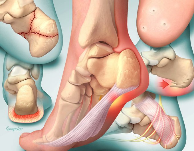 Various causes of heel pain, illustrated by #JohnKarapelou / Biomedical Art.