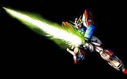 His Gundam, the Shining Gundam, has a few things you might recognize from a certain blue boy