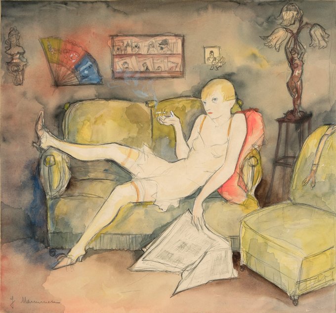 Jeanne Mammen- Hure auf einer grünen Couch - Whore on a green couch (Garçonne) c. 1931.