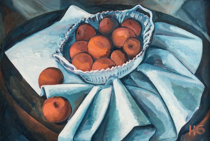 Hilde Goldschmidt- Obstschale auf weißem Tuch.