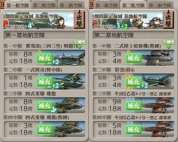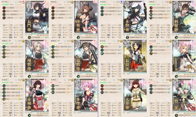 e3-3甲編成です ぜかましさん編成で 噴式2積みで手数を増やして、道中支援と全キラで道中無理やり抜けますw 長良とジェーナスは対潜と夜戦補助、利根と大井っち(サブ)は連撃でよかったのかな? 基地は特効を出来るだけ入れたけど、まあ死ぬ 本体も基地も熟練付け、なしw #艦これ #e3-3