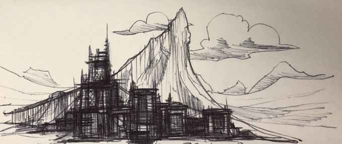 A random ballpoint #sketch of an #offplanet #colony 27/365 #dailysketch #sketchbook #scifi #scifiart #landscape #mikephillipsart #ink #doodle #drawing #peak #pinnacle #settlement