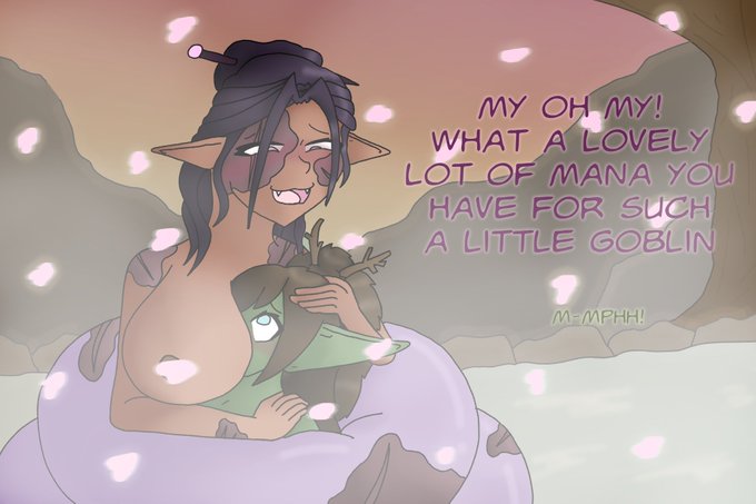 Reina, resident Lamia of a small hot springs village, managed to lure a goblin into the water, where her long tail was waiting. Coiling up the unfortunate Nica while she gently sapped away the gob's mana.