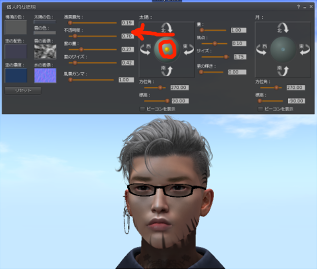 照明> 太陽の黄色い丸をマウスで動かして(SSは西日)少し若返りました