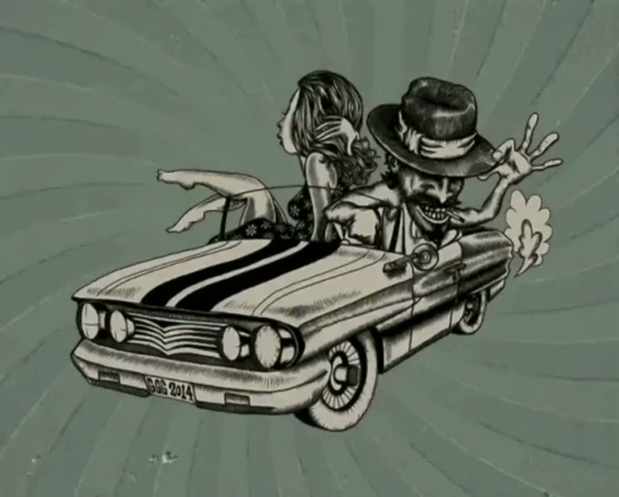 This is original illustration depicts a couple leaving their vintage car while the driver makes a gesture meaning "Ya me voy" or "I'm leaving"