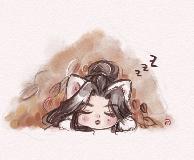 Doodled a sleeping Nyanning beneath a pile of leaves 🍃 today, since I didn’t feel like ink🤣
