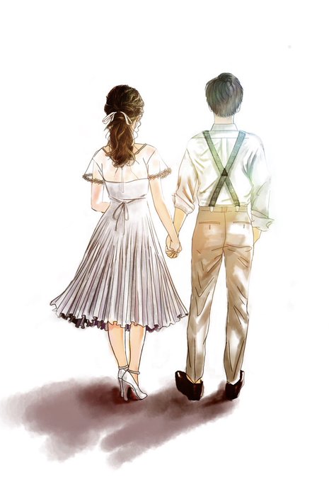 これから2人で死ぬの?みたいなイラストになってきた、、。なんで?!!(カジュアルウエディングの後向き全身イラスト頼まれたのね)