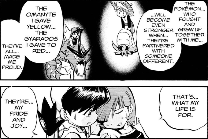 In Pokémon Black/White 2 and Masters EX, there is a reference to the Pokémon Adventures manga, when Misty falls into Crystal's arms and says that the Gyarados and Omanyte she gave to Red and Yellow are her pride and joy.