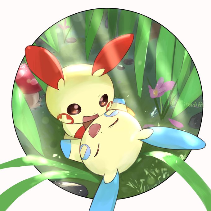 茂みでじゃれあうプラスル&マイナン #ポケモン 夏のうちに夏っぽい絵を描けて満足である。