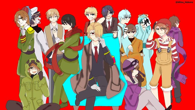 緑の方...w一昔前は敬語で喋ってたのが今は...w お互いさん付けだったね✨ 私の名前ねこせいみつきだったもんね?wwwwww そして私も間違えたもんね!?w お互い様だァ...w #緑の狙撃者 #雨に響く狐歌 #紫JK #子羊の歌 朧さん入る前の絵です...w