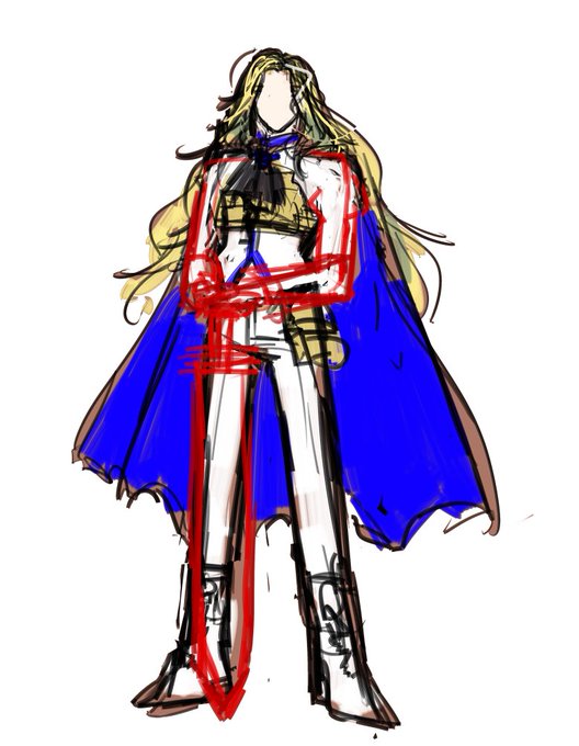 ラフ→スクショ残ってたとこまで。線画ある立ち絵にしようと思って描いてたんだけど、ヒラヒラと剣と髪の線画が描けなくてイ"----ッ!!てなって結局厚塗りになっていた(おわり)