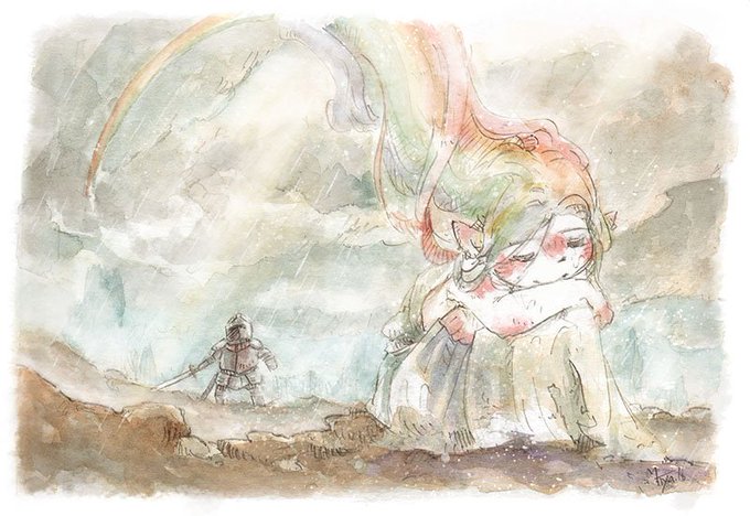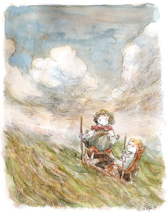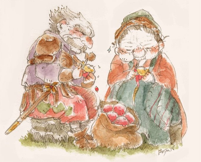 ざっくりらくがきで深い谷底のお話の老人ふたり。おじいさんは元騎士で、剣は持てるけどりんごの皮をむくとじゃがいもになるらしい…