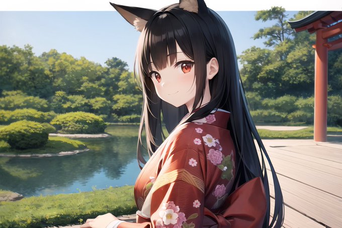 日本庭園、黒髪きつね娘ちゃん