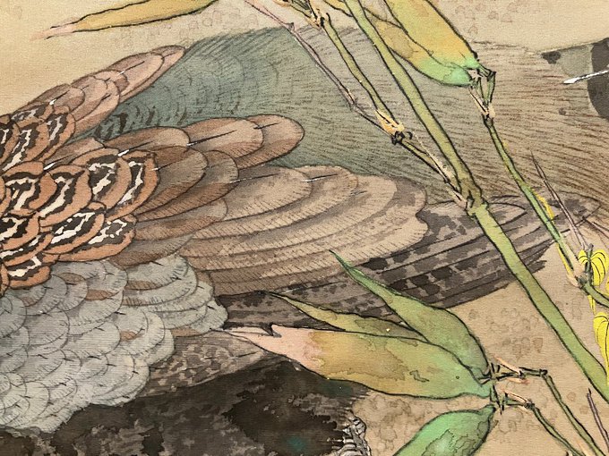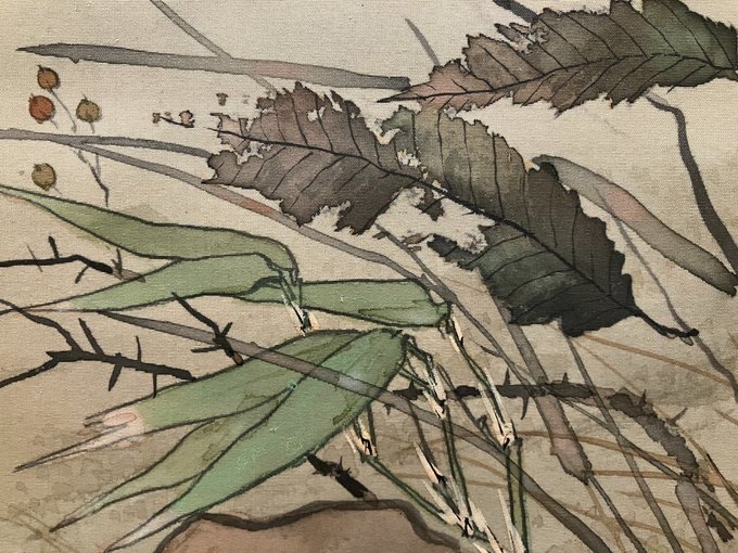 #節分 に相応しく鬼のいる日本画をご紹介👹ヒョウ柄パンツの鬼がコワモテ鍾馗に首根っこを摑まれ手足をじたばたさせています。アーレーって感じの表情が何とも可愛い…💕鍾馗の足がむっちり系なのも何気にほっこりします☺️#3月21日まで