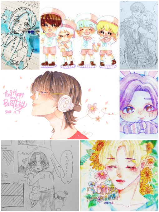 コピックかシャーペン、水彩でセブチ(主にジスハン)のFAばっか描いてる99line😊😊