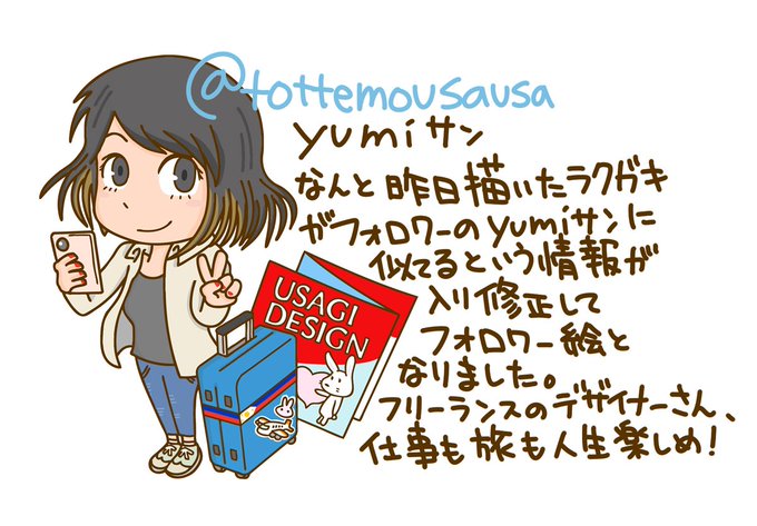 昨日描いた海外旅行女子のラクガキがyumiさん(@tottemousausa )に似ているということで修正してフォロワー絵となりました