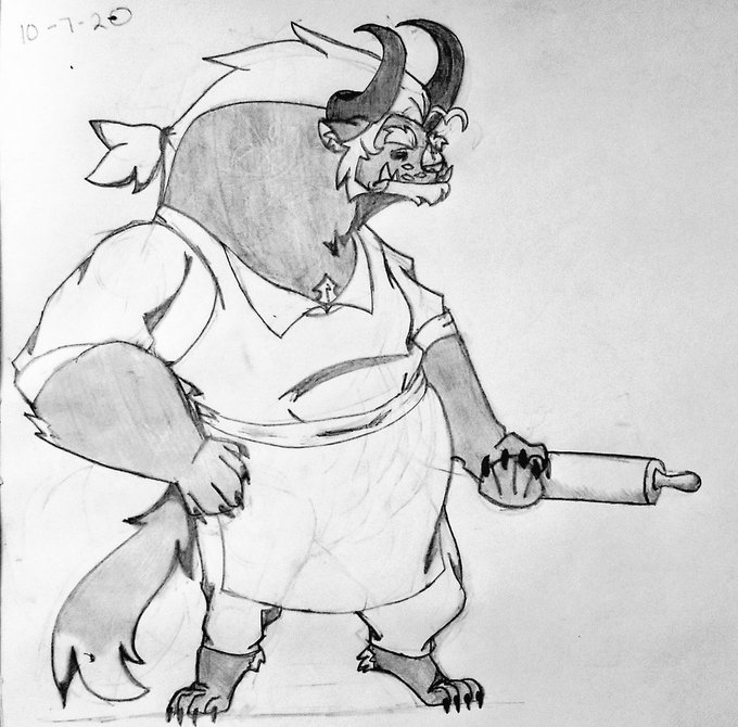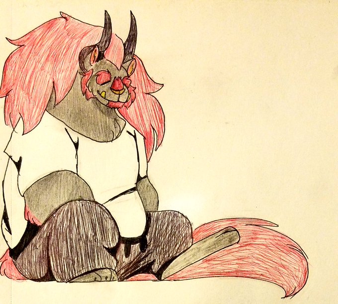@Neytiirix My OC. Valium. He's a hellhound but actually a giant lava fire cat. Has fur. He's a baker and scary to everyone but he's the dad guy of his town.