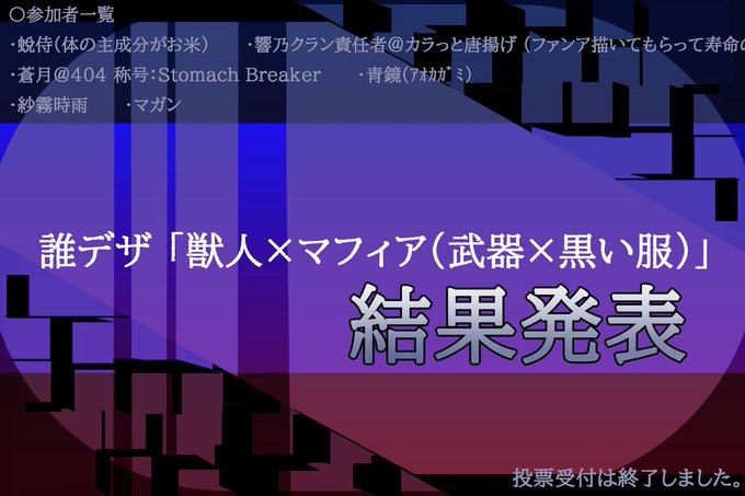 【クリスマスは近い!1年はあっという間!!キャラクター誰デザ大会!!!】 今回のお題は「獣人×マフィア」! みんなの個性溢れるキャラクターが勢揃いだ!!各々が表現する悪属性がとってもクールだぞ!! さて、誰がどのキャラクターをデザインしたかな!!! リプ欄から投票だ!!