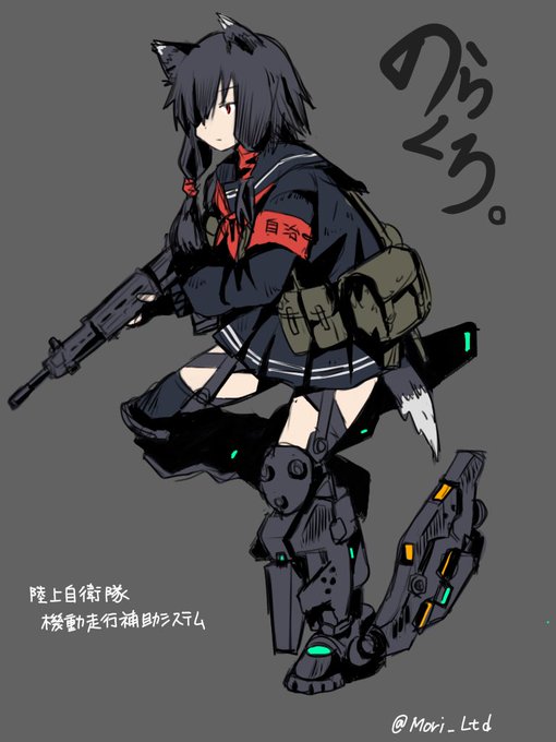 #OC #武装JK #盛製作所 名前はない。敵味方から「黒」と渾名される。内戦状態の日本で闘う「獣憑き」の少女。廃墟となった倉庫で戦争で出荷されず放置されていた制服を着ている。本人曰く、誰も着ないので予備に困らない。愛用の銃は自衛隊の89式小銃。旧式化した脚部アシストギアを使うことも。