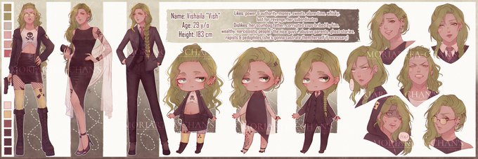 My bby Vish got a character sheet from me! I had to redesign her mostly for her to look more like an adult haha Since she's 29 y/o. Also a smoll color palette change and the biggest of them all - new clothes to suit her more - since she's from a wealthy family. I love my bby 💞