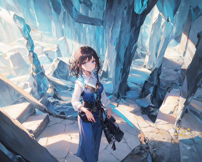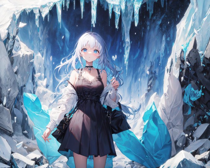 girl walking in to ice cave,blue theme illustration, プロンプトコレだけ #AIart