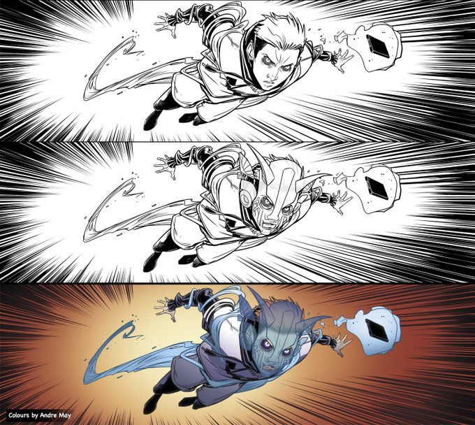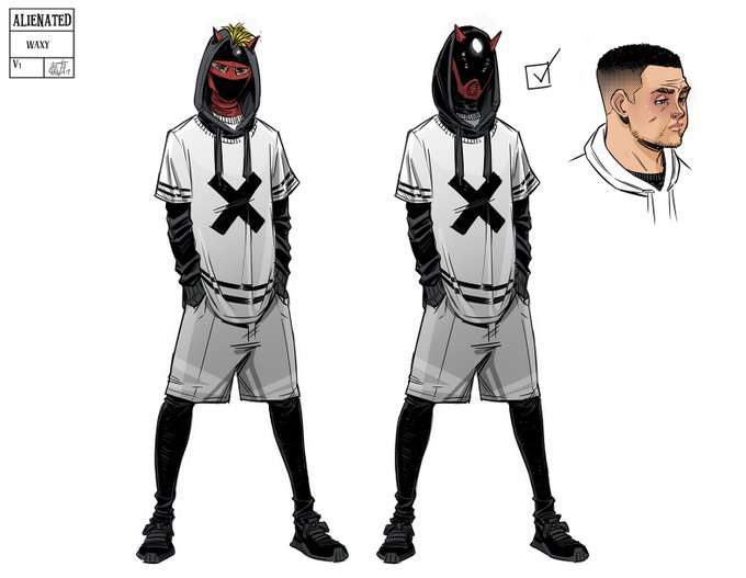 Thinking today about when working on ALIENATED, In Issue 6 where Samuel creates himself a 'war mask' with Chip's energy, we drew & coloured a whole face under that mask in every panel just to go that extra mile. A lot of extra work but well worth it for that look.