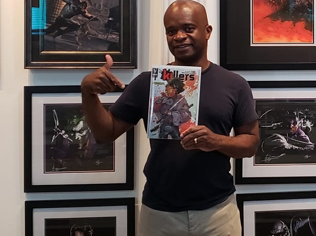 Editor extraordinaire @illmasterone of @a_wave_blue_world stopped by the gallery 2 check out our newest exclusive cover from @ValiantComics #Killers #1 by superstar artist @jonboy007007 & written by @bclaymoore & interiors, illustrated masterfully by @fernandodagninoguerra