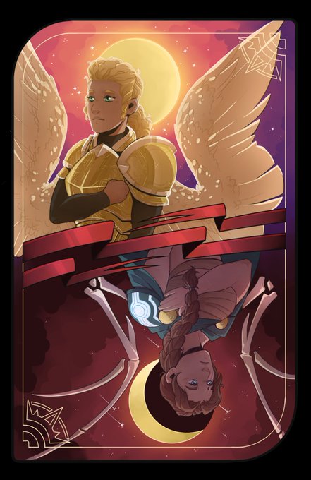 DND card commission done for friend @IfSheBeWorthy !! Featuring their fallen aasimar and her sister 🍂🍃
