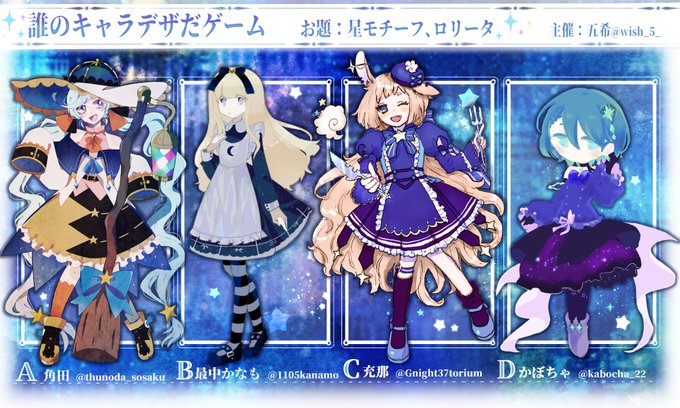 いつーーーきしゃん主催企画 #誰のキャラデザだゲーム に参加させて頂きました!お題は星とロリータで、私はGのデザインを描かせて頂きました…! リプツリーにアンケート繋げるので、ぜひ私っぽいデザインにぽちっとお願いします~!!