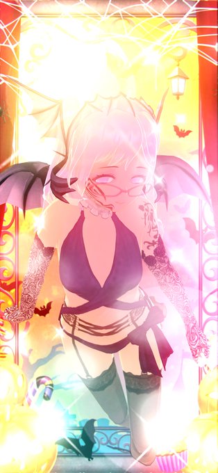 ①デコモードでハロウィンの背景とフレームをスタンプで調整、ビネット&ブルームかけて撮影、②カスタム背景として読み込んだらサキュバスっぽいサラちゃんを配置、さらにスタンプ重ねて撮影! デコレーションに熱中して危なく時間制限忘れるとこでした!いつもなら文字入れとかもう少し遊ぶので…!