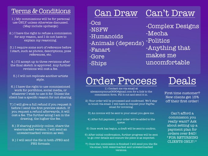 @kinomiiqu @artists4work I have an anime-esque style and I focus on character work. Here are my prices. HMU if you’re interested.