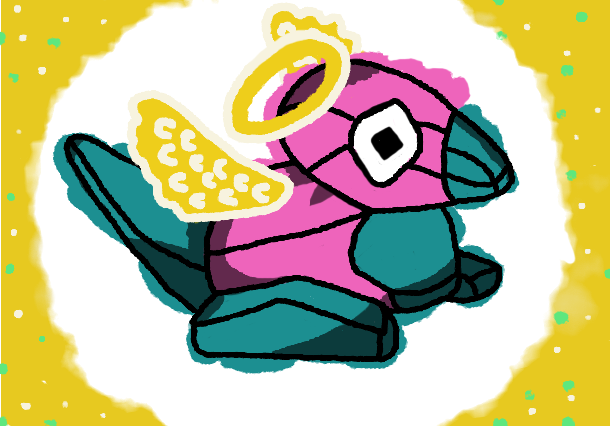 Après une séance de dessins random hier soir avec des amies, j'ai eu envie d'essayer un style de dessin en prenant comme modèle, une peluche d'un Porygon, et donc voilou un petit gongon céleste uwu